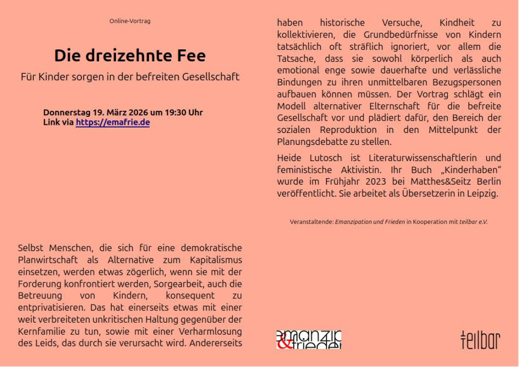 Vortrag Heide Lutosch: Die dreizehnte Fee. Für Kinder sorgen in der befreiten Gesellschaft – Do. 19. März 2026 um 19:30 Uhr – online