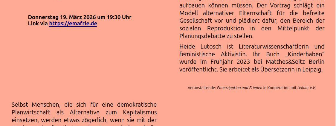 Selbst Menschen, die sich für eine demokratische Planwirtschaft als Alternative zum Kapitalismus einsetzen, werden etwas zögerlich, wenn sie mit der Forderung konfrontiert werden, Sorgearbeit, auch die Betreuung von Kindern, konsequent zu entprivatisieren. Das hat einerseits etwas mit einer weit verbreiteten unkritischen Haltung gegenüber der Kernfamilie zu tun, sowie mit einer Verharmlosung des Leids, das durch sie verursacht wird. Andererseits haben historische Versuche, Kindheit zu kollektivieren, die Grundbedürfnisse von Kindern tatsächlich oft sträflich ignoriert, vor allem die Tatsache, dass sie sowohl körperlich als auch emotional enge sowie dauerhafte und verlässliche Bindungen zu ihren unmittelbaren Bezugspersonen aufbauen können müssen. Der Vortrag schlägt ein Modell alternativer Elternschaft für die befreite Gesellschaft vor und plädiert dafür, den Bereich der sozialen Reproduktion in den Mittelpunkt der Planungsdebatte zu stellen.