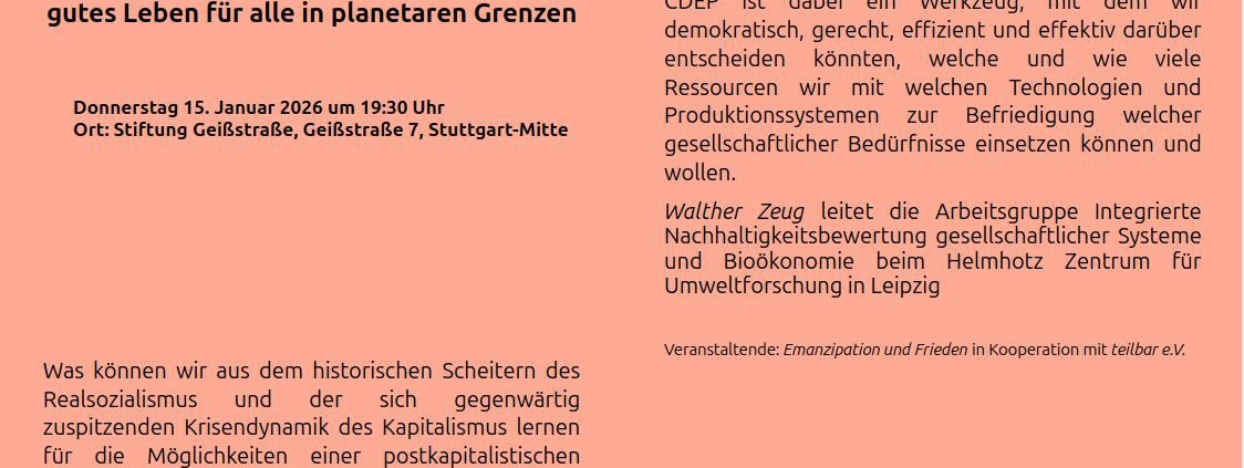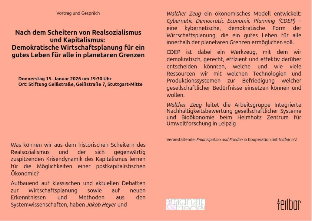 Vortrag Walther Zeug: Nach dem Scheitern von Realsozialismus und Kapitalismus: Demokratische Wirtschaftsplanung für ein gutes Leben für alle in planetaren Grenzen; Donnerstag 15. Januar 2026 um 19:30 Uhr; Ort: Stiftung Geißstraße 7, Stuttgart-Mitte